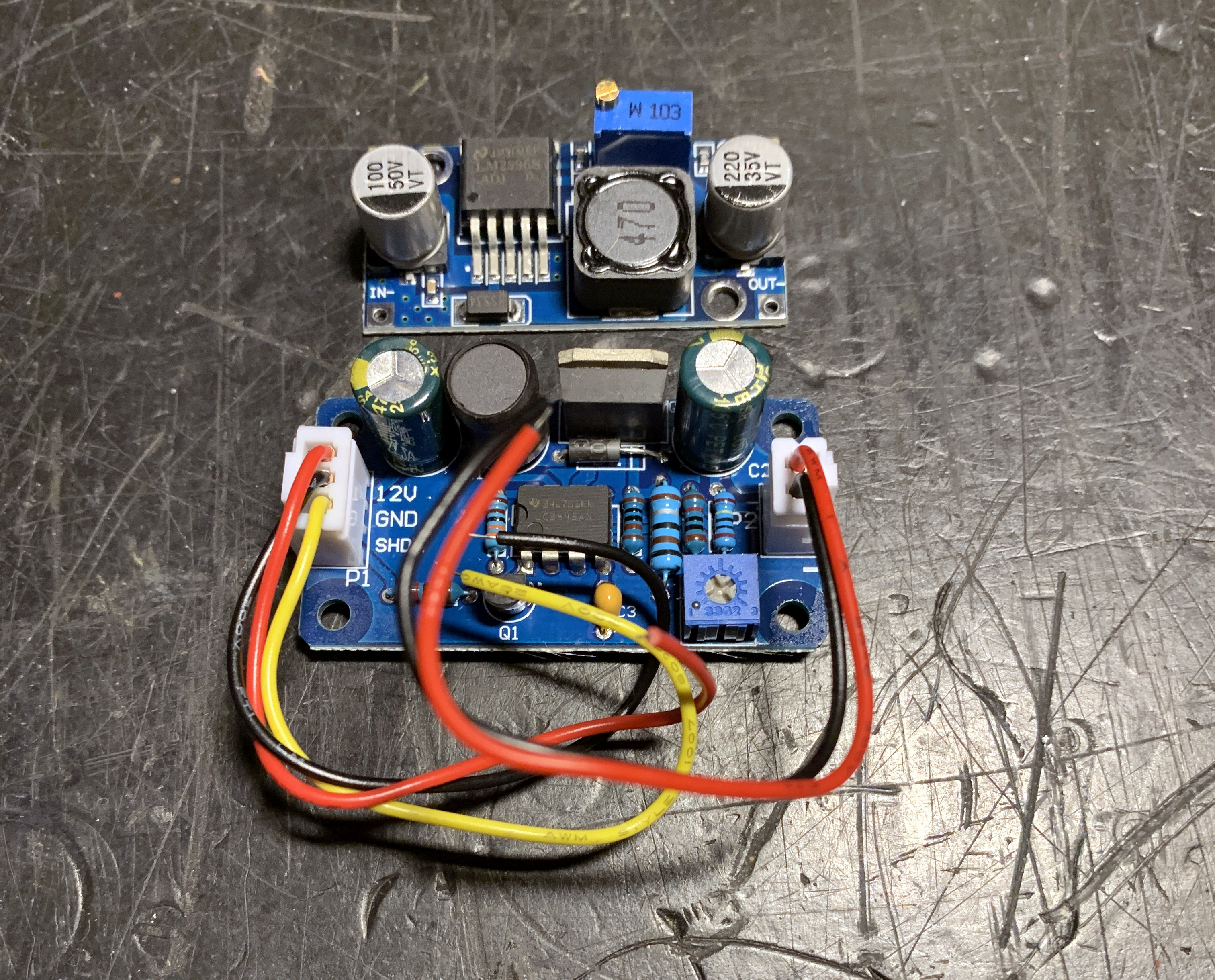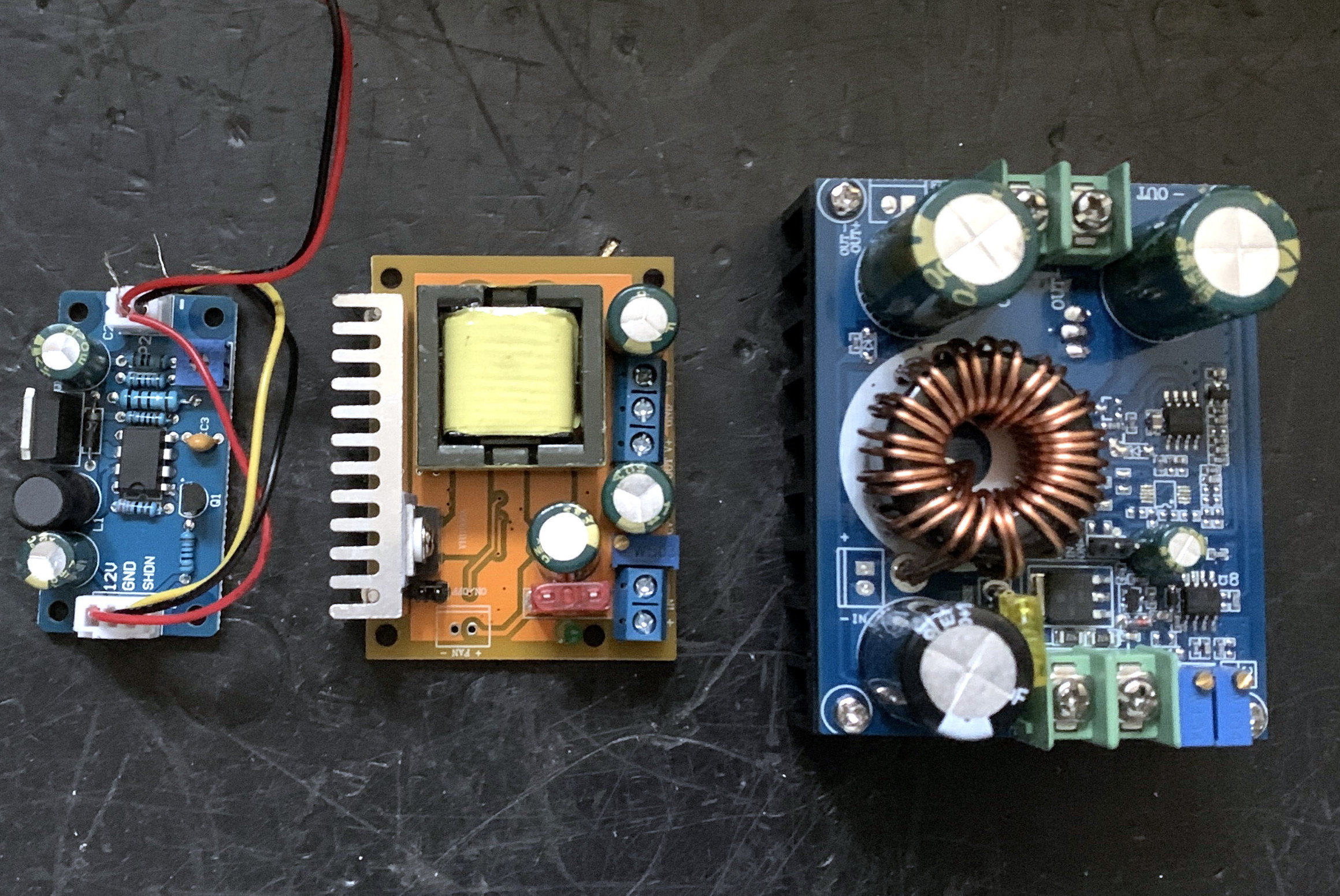 2. Beide printjes hebben een instelpotentiometer en ze komen ingesteld op de maximale uitgangsspanning. Om de gewenste spanning af te stellen moet je ze terwijl je ze op de 12 volt hebt aangesloten eerst helemaal naar minimum draaien en dan langzaam omhoog naar wat je wilt hebben. Draai je de potentiometer eerst helemaal dicht en zet je dan pas de ingangsspanning er op dan werkt het niet. Geen idee waarom, maar dit was mijn ervaring. Experimenteer er even mee.