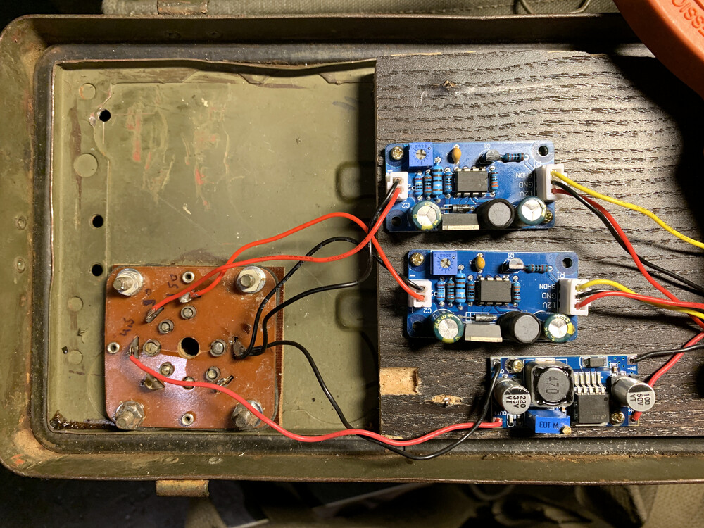 Eerst sloot ik de step down converter aan op de gloeidraden en de 12 volt ging er op. Er ging 250 mA de set in. Dat is ruim binnen de 2A die deze converter kan leveren. De spanning bleef mooi stabiel op 4,5 volt.