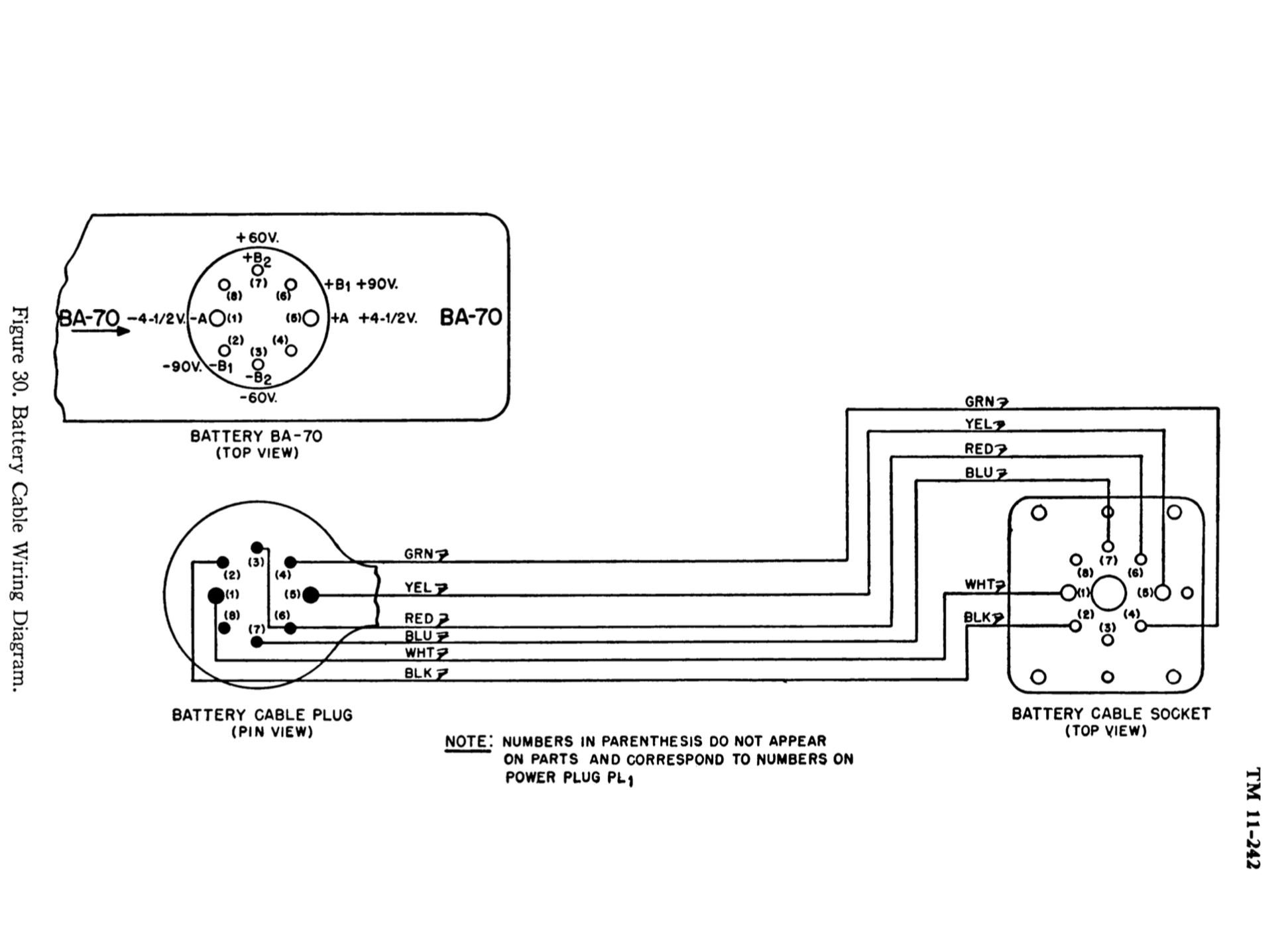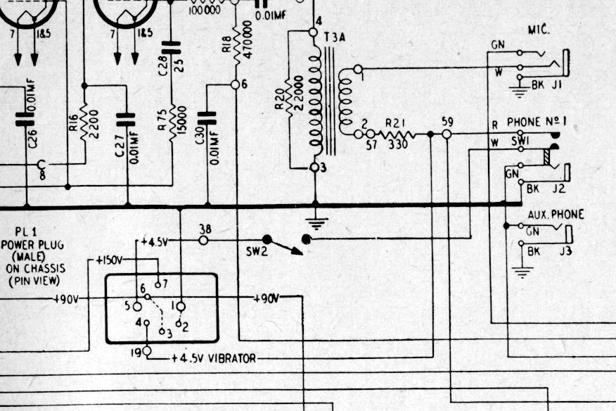 Als je op de aansluitgegevens van de batterij kijkt dan lijkt het of er alleen 60 volt op pen 7 staat. Maar in de batterij zijn de + en de – van het 60 volt gedeelte los van de rest en in de kabel wordt de 60 volt in serie met de 90 volt gezet door een intern draadje van pen 3 (-60) naar pen 6 (+90) en zo komt er toch 150 volt op pen 7. In het schema van de set zie je dit draadje ook zitten tussen 3 en 6. Dit is gedaan om de batterij recht op de set te kunnen prikken wanneer de set niet in de kast zit. Dan staat de set toch correct onder spanning om hem te kunnen afregelen.