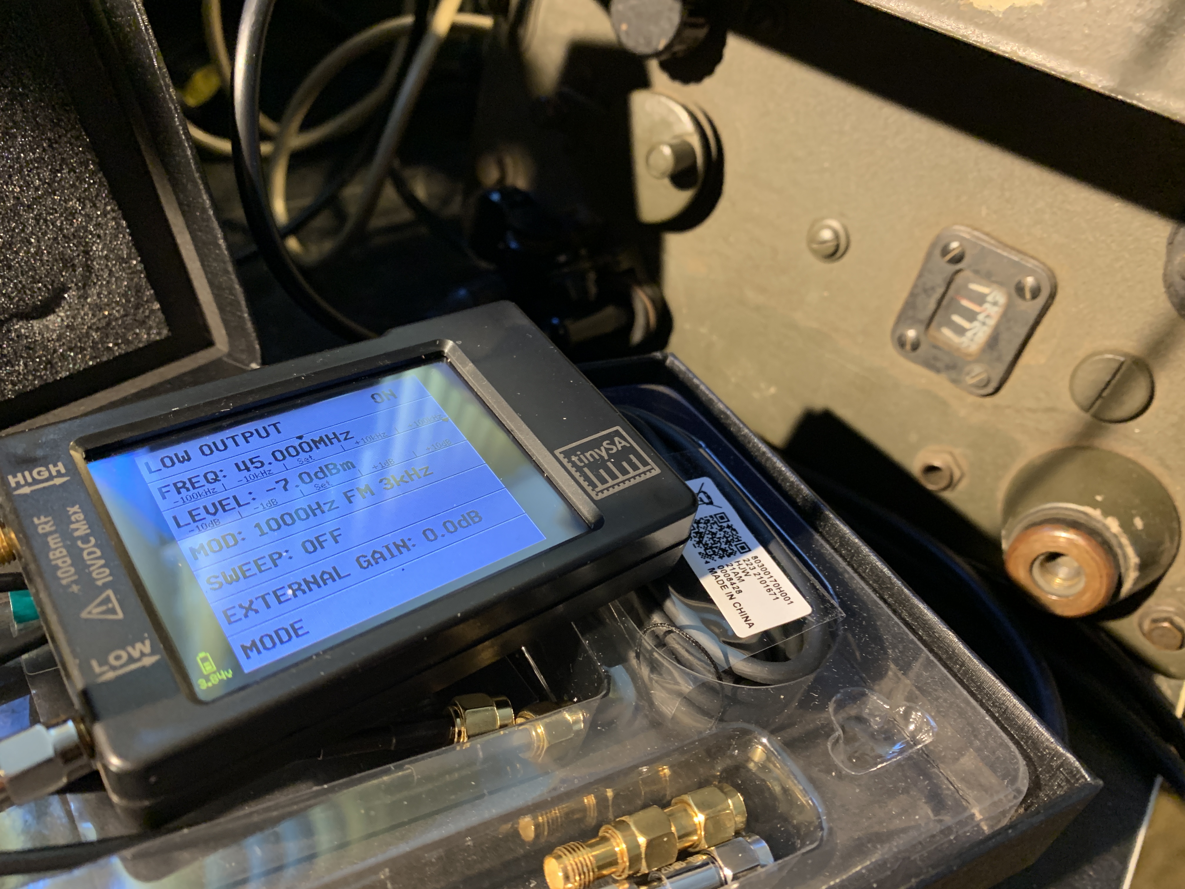 Daarna de 90 volt converter er bij. Hier ging 33 mA de set in lopen. En ziedaar: ruis uit de luidspreker! Eens kijken of hij ontvangt. Ik had de BC1000 op kanaal 25 gezet, dat is 45 MHz. Met de wonderbaarlijke TinySA miniatuur spectrum analyzer en meetzender een carrier van 45MHz gegenereerd met een FM piep er op en ziedaar: ontvangst! De BC1000 deed het met deze twee converters.