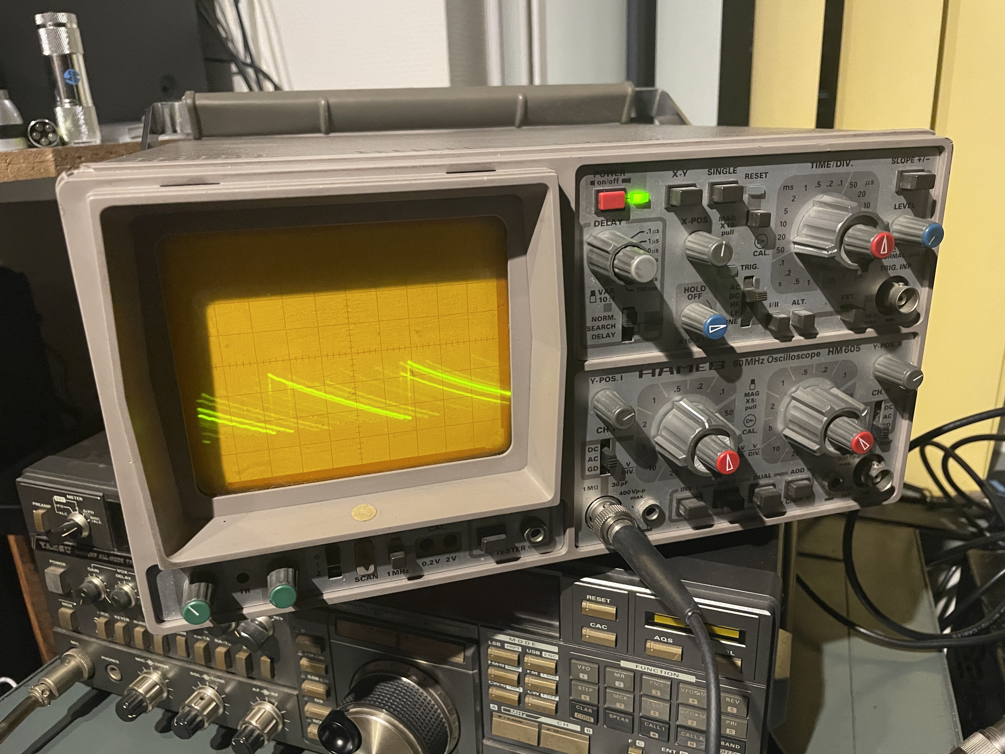 Toen ik de ZVS converter op 150 had afgeregeld en aansloot en de set aan zette, hoorde ik een irritante tik van iets van 10 Hz door het ontvangst audio heen. Kijkend met de scoop bleek er een zaagtand storing van 10 Hz 75 mV pp op de 150 volt te staan met een zeer steile piek. Toen ik vervolgens de zender aan zette kwam er prima signaal uit de set maar zat er een duidelijke jank in het uitgezonden audio. Het was net als de Philips CMT of Zephyr mobilofoon indertijd, die hadden ook zo’n piep door het audio. Dus die zaagtand ging in frequentie omhoog naarmate de converter belast werd. Dat schoot ook niet op. Met een relais de converter alleen bij zenden aanzetten was een probleem want er kwam elke keer een enorme vonk over de contacten. En die jank kon ik er niet uit krijgen.